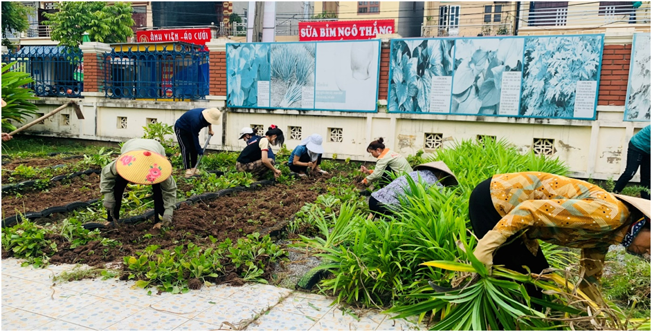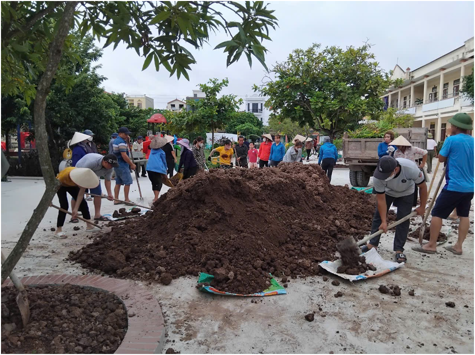 Bên cạnh đó, nhà trường còn nhận được sự ủng hộ nhiệt tình của các bậc cha mẹ trẻ. Cha mẹ trẻ đã cùng cô giáo lao động vệ sinh môi trường bên ngoài đảm bảo cảnh quan sạch đẹp cho các con hoạt động. Dưới đây là một số hình ảnh của các các cô giáo và các bậc cha mẹ trẻ trong buổi lao động: