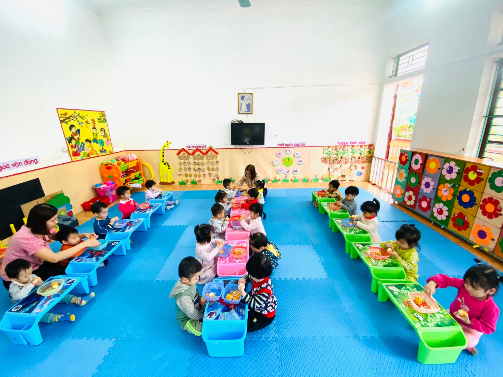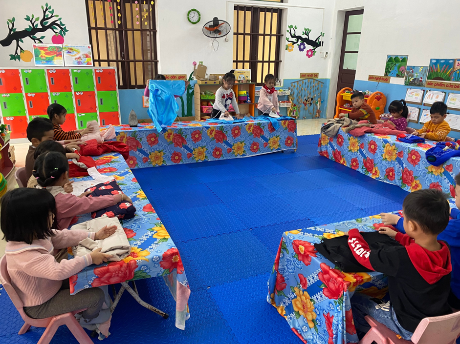 Song trên thực tế, trong xã hội hiện nay các gia đình thường chú trọng đến việc học kiến thức của trẻ mà không chú ý đến phát triển các kỹ năng cho trẻ. Luôn che chở, nuông chiều, làm hộ trẻ khiến trẻ ỷ lại, ích kỷ, không quan tâm đến người khác và các kỹ năng trong cuộc sống rất hạn chế. Khó khăn cho trẻ trong việc có tình huống bất ngờ xảy ra. Nhận thức rõ được vai trò và vị trí quan trọng của việc giáo dục kỹ năng sống cho trẻ trong trường Mầm non tập thể cán bộ, giáo viên trường Mầm non xã Nghĩa Thái đã đưa ra rất nhiều biện pháp giáo dục kỹ năng sống cho trẻ: Giáo dục kỹ năng sống cho trẻ thông qua các tình huống; thông qua nội dung các câu chuyện; thông qua hoạt động vui chơi… Từ đó truyền cho trẻ những kinh nghiệm sống của người lớn. Nhằm giúp trẻ có những kỹ năng đương đầu với những khó khăn trong cuộc sống. Trẻ biết vận dụng, biến những kiến thức của mình để giải quyết những khó khăn trong cuộc sống cho phù hợp. Để dạy cho trẻ những kỹ năng đó giáo viên đã luôn tạo cho trẻ có môi trường để trải nghiệm, thực hành. Dưới đây là một số hình ảnh: