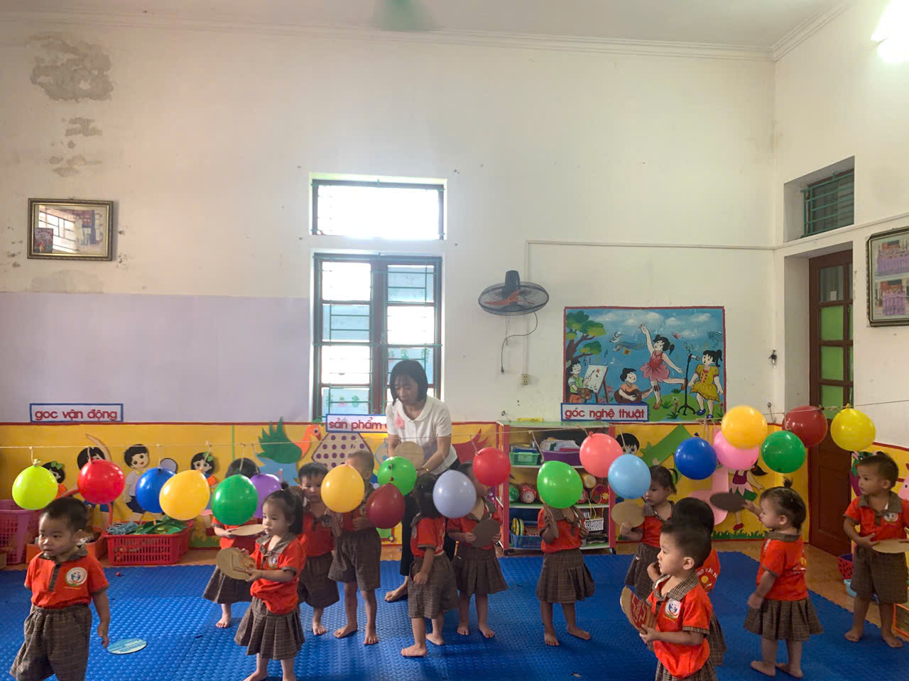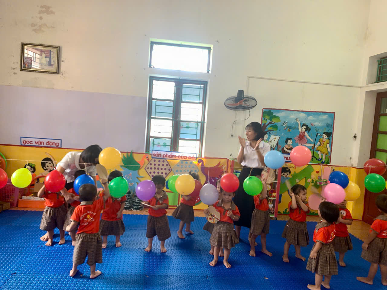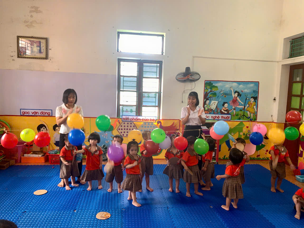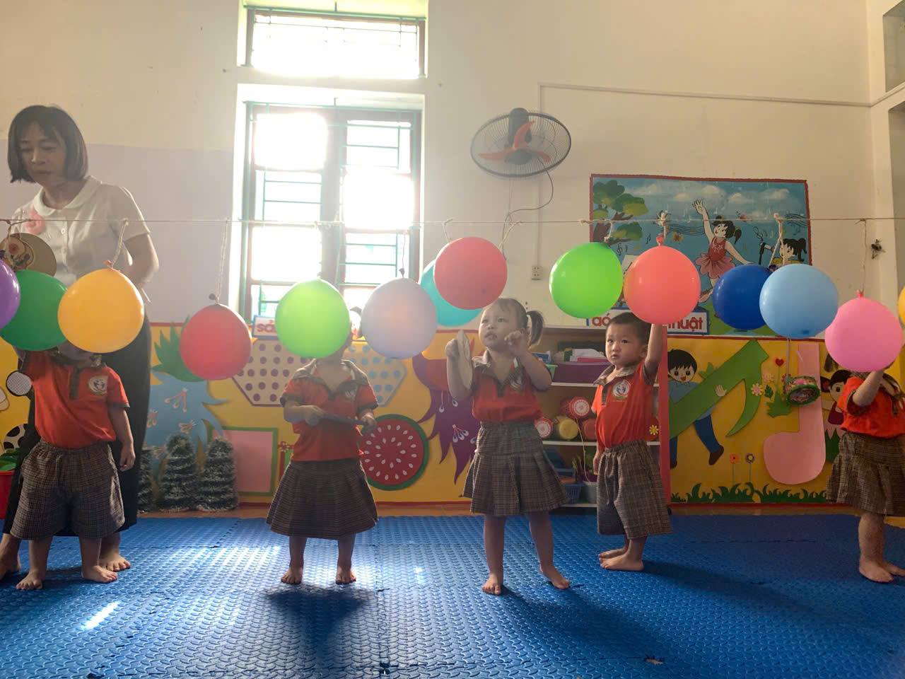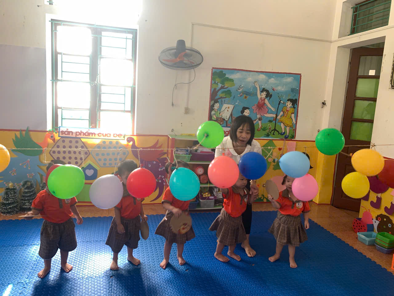 - Cách chơi: Trẻ sẽ dùng tay cầm 1 tấm bìa cattong hình tròn để đập bóng bay, cố gắng làm bóng nổ. Trong quá trình chơi, cô luôn hướng dẫn và đảm bảo an toàn cho các con.