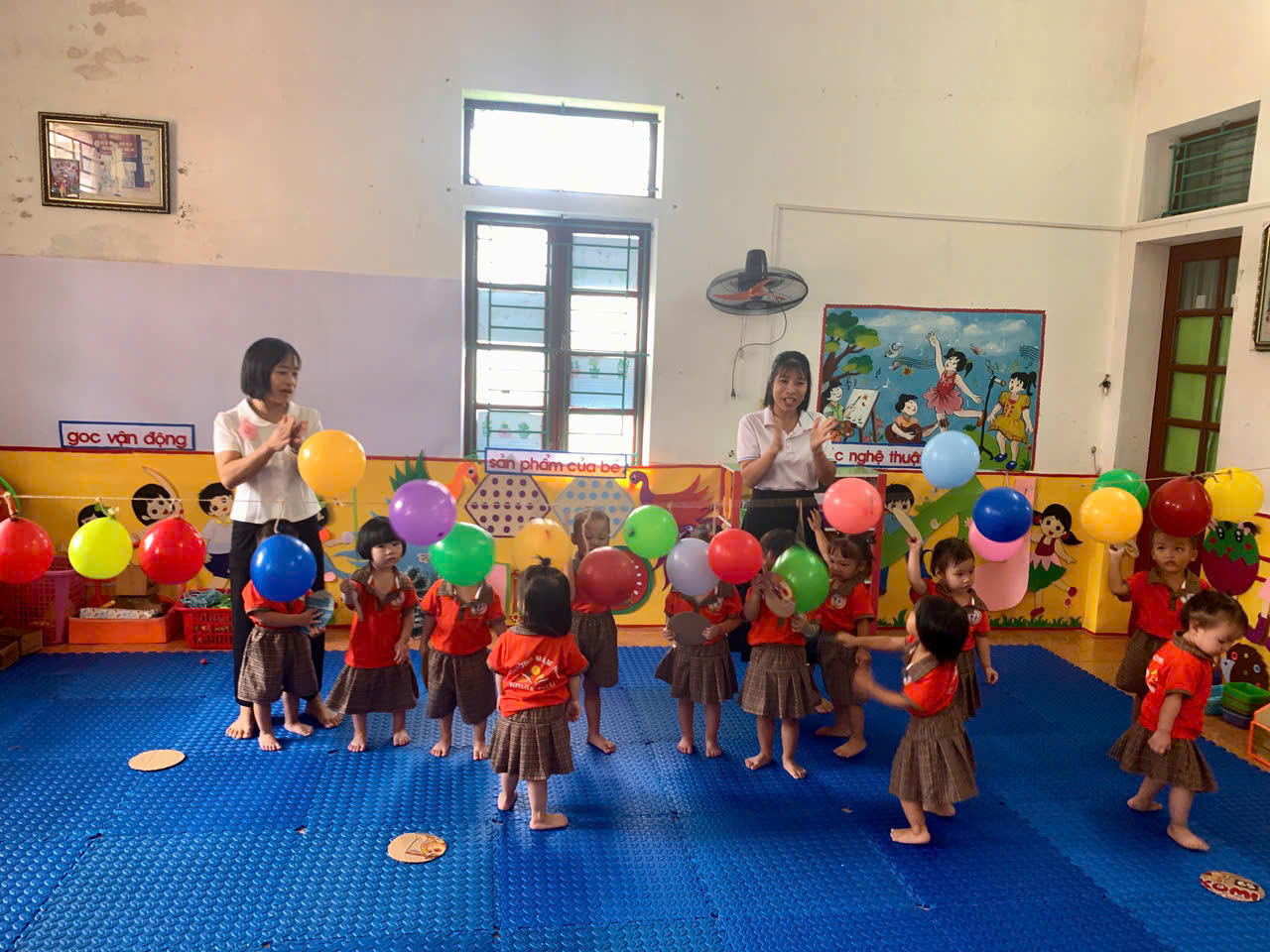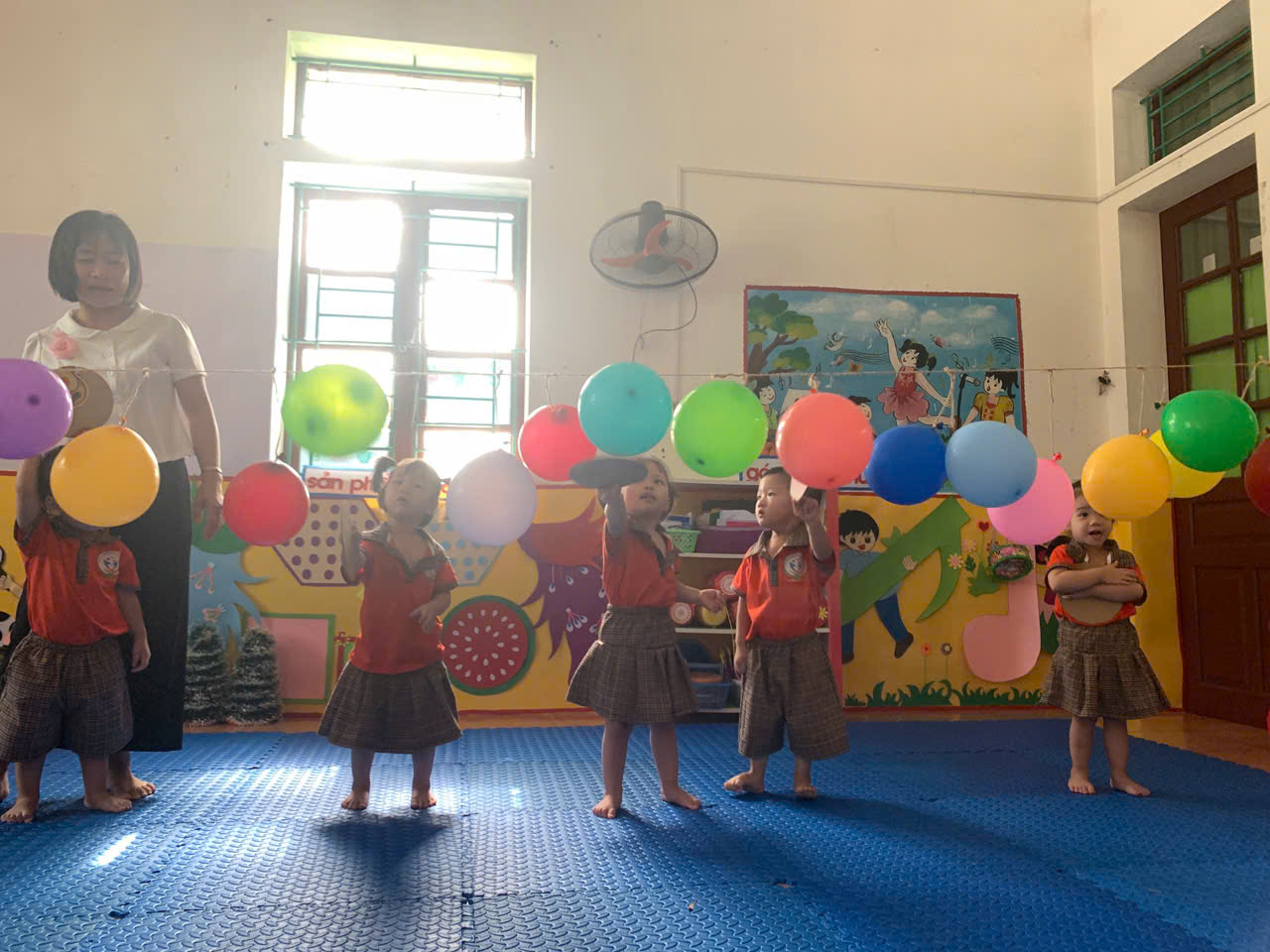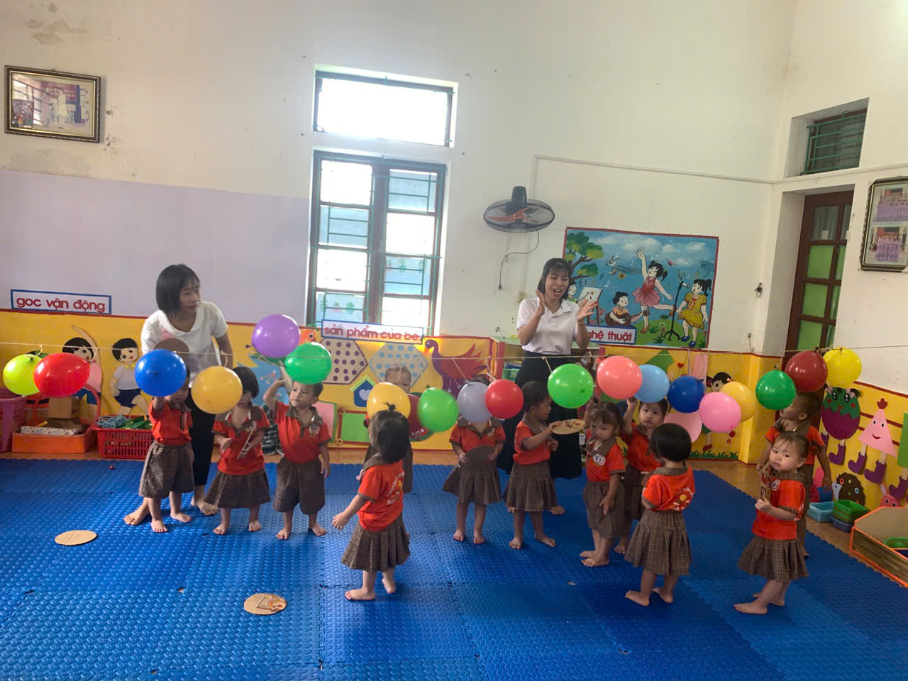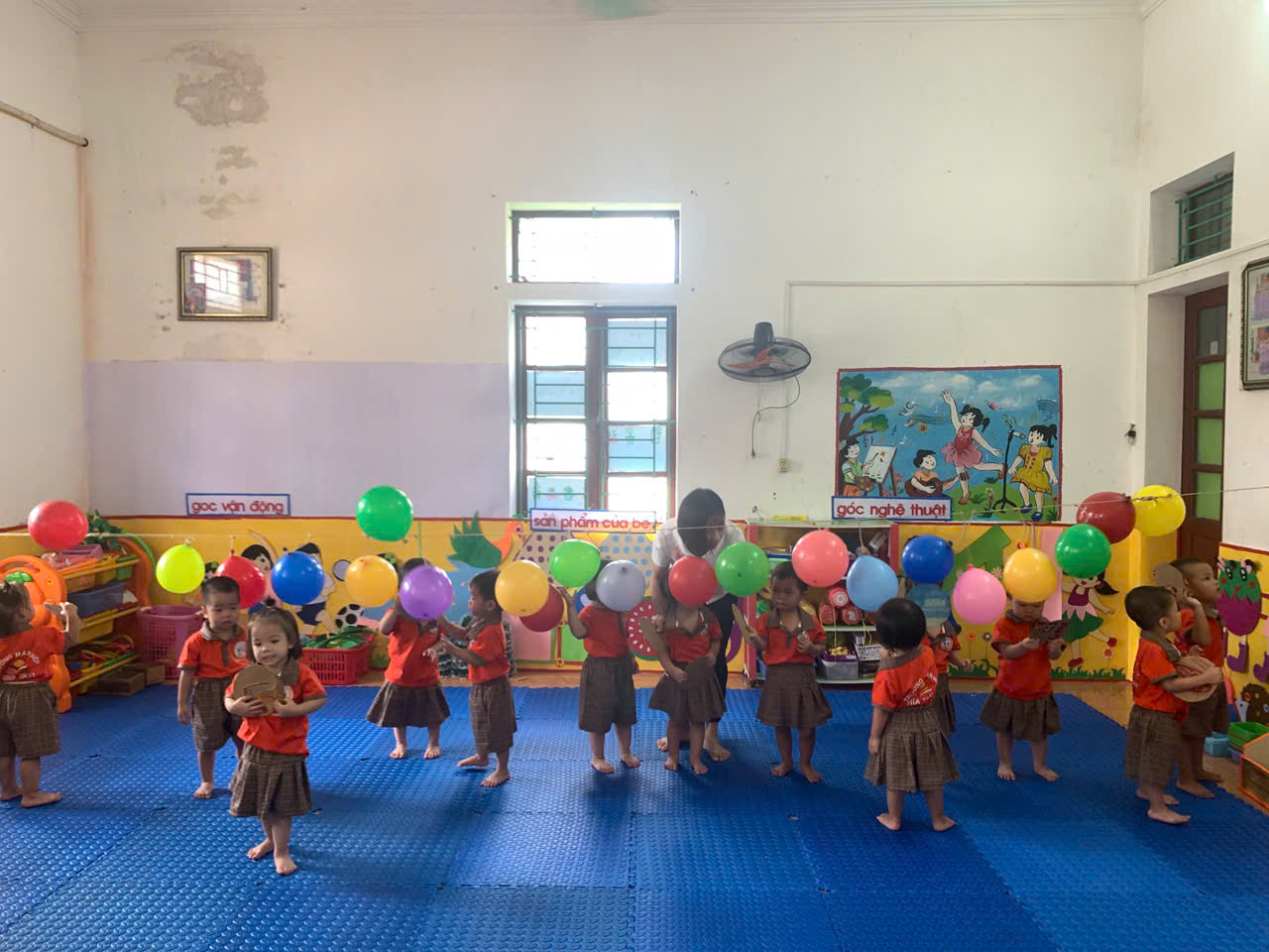 - Cách chơi: Trẻ sẽ dùng tay cầm 1 tấm bìa cattong hình tròn để đập bóng bay, cố gắng làm bóng nổ. Trong quá trình chơi, cô luôn hướng dẫn và đảm bảo an toàn cho các con.