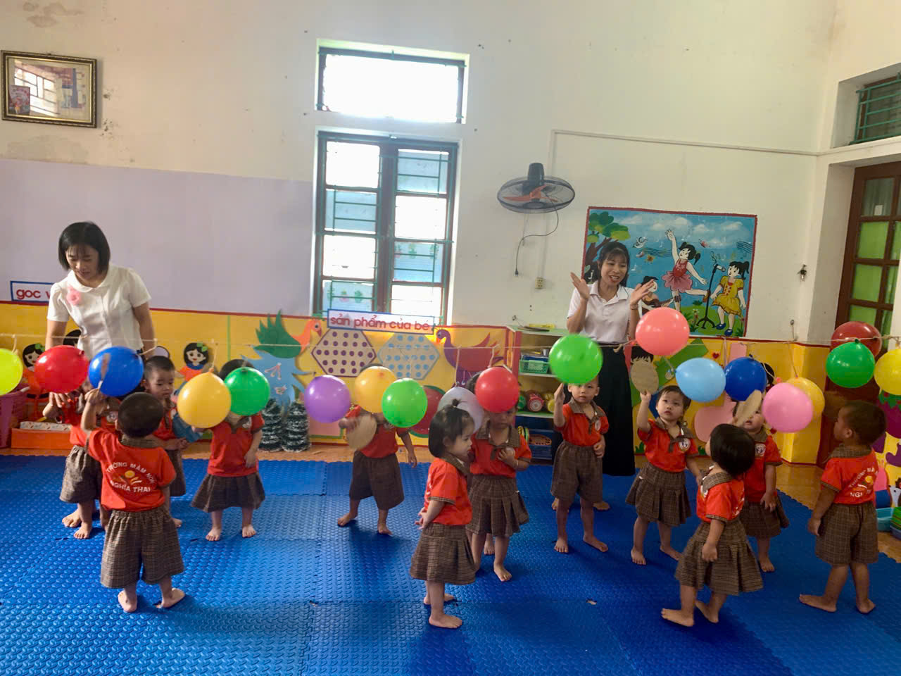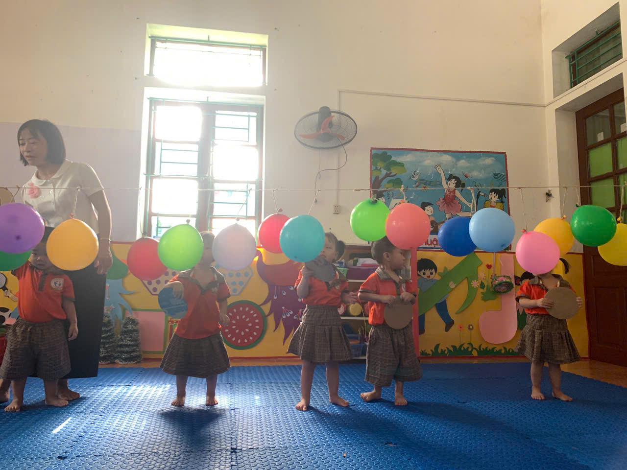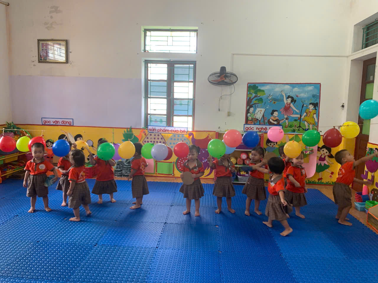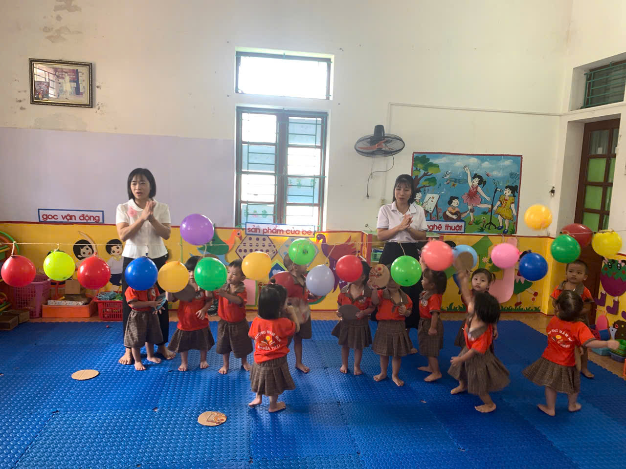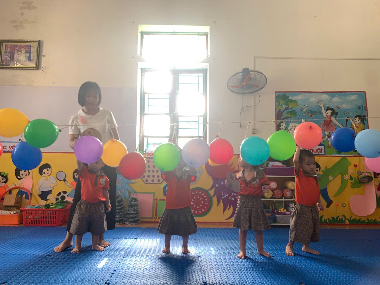- Cách chơi: Trẻ sẽ dùng tay cầm 1 tấm bìa cattong hình tròn để đập bóng bay, cố gắng làm bóng nổ. Trong quá trình chơi, cô luôn hướng dẫn và đảm bảo an toàn cho các con.