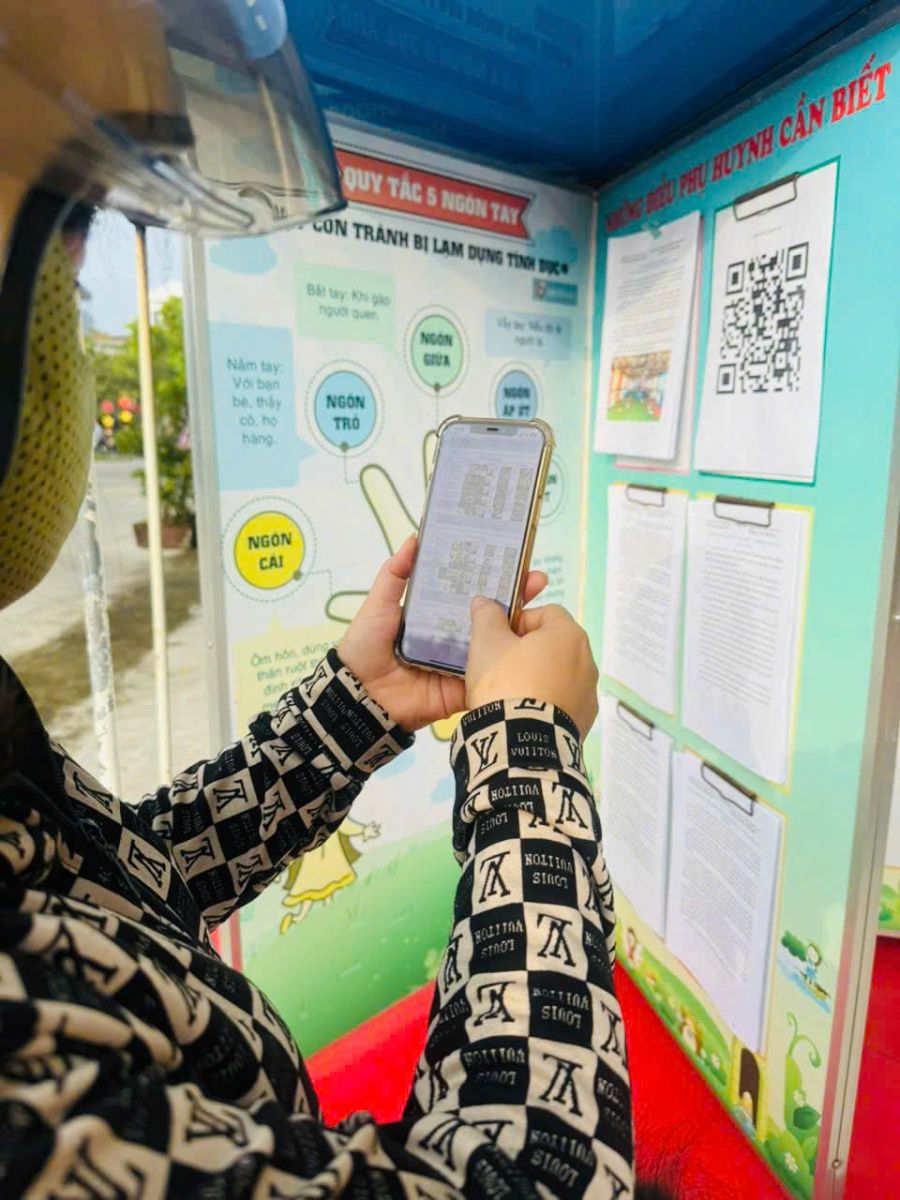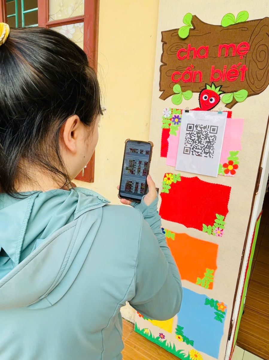 – Mã QR tại khu vực bếp và bảng tuyên truyền giúp cha mẹ dễ dàng tra cứu thực đơn, thông tin an toàn thực phẩm.