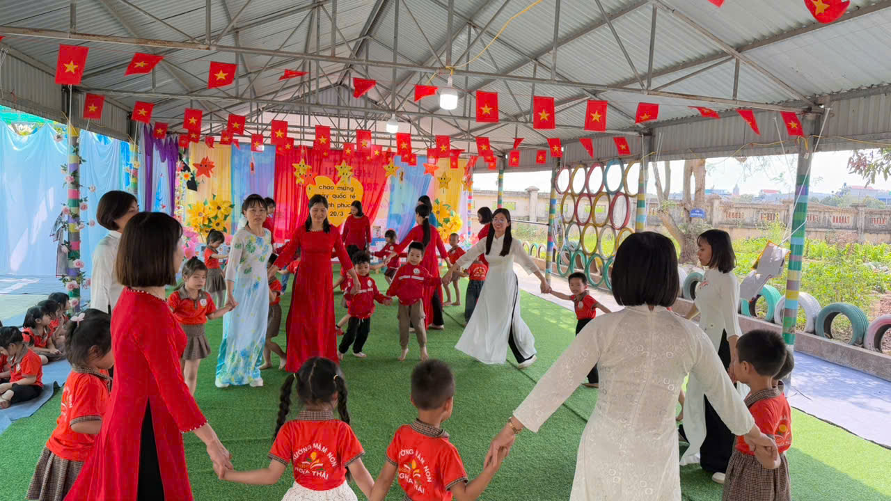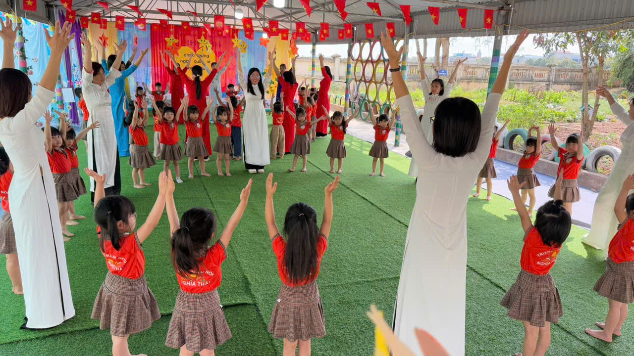 Trong không gian rộn ràng của những giai điệu quen thuộc, các bé cùng cô giáo nắm tay nhau tạo thành những vòng tròn xinh xắn. Tiếng nhạc vang lên, từng bước chân nhịp nhàng, từng nụ cười rạng rỡ hòa quyện tạo nên một bức tranh đầy màu sắc của niềm vui và sự gắn kết. Các con vừa hát, vừa vận động theo nhạc, cùng chia sẻ những cái nắm tay thật chặt, những ánh nhìn thân thương với bạn bè và cô giáo.